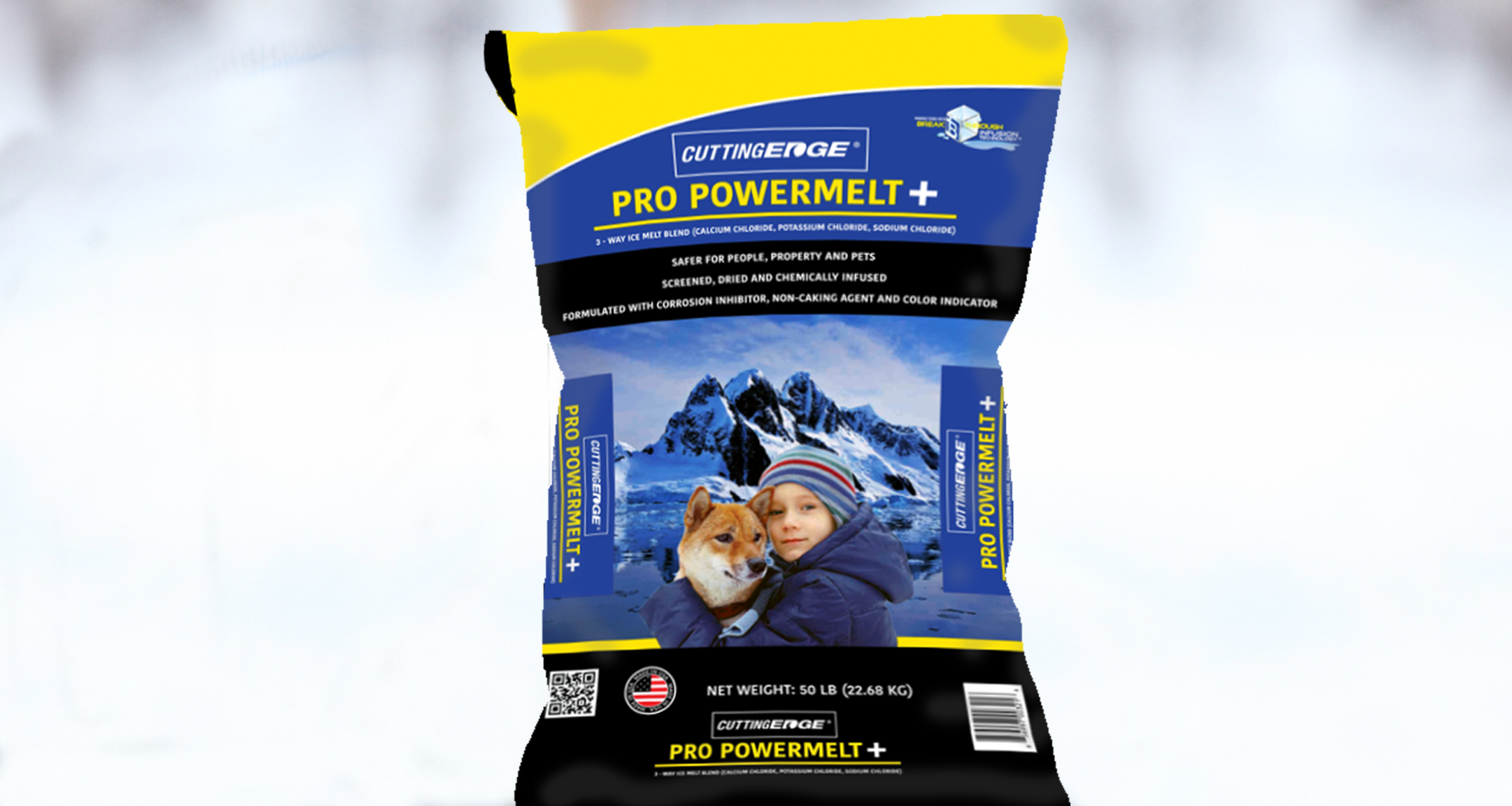 Cutting Edge® Pro PowerMelt + provides all the melting speed, power and safety you need for extreme weather conditions. Manufactured using patent pending Breakthrough Infusion Technology™, for a fast-acting, more efficient, longer lasting product. Infused with calcium chloride, potassium chloride, corrosion inhibitor, anti-caking agent and highly visible green color indicator.