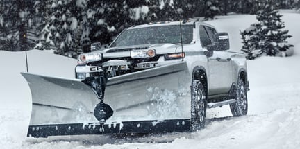 The Chevy Silverado HD comes standard with a 6.6-liter V-8 gas engine with direct injection and a 6-speed automatic transmission, delivering 401 hp and 464 lb.-ft torque. The front end is designed for easier mounting of plow hardware and eliminates the need to drill additional holes in the front bumper. When the plow blade is removed, the Silverado HD returns to form by maintaining a smooth, integrated appearance without visible hardware.