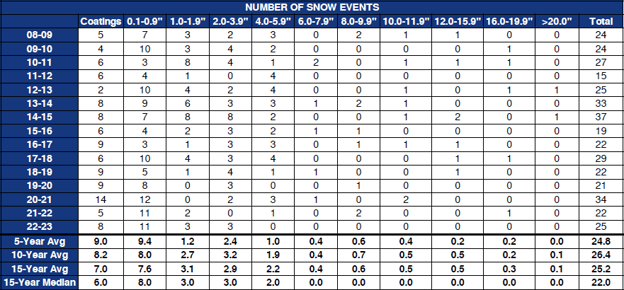 A “normal” or average snowfall may only occur one-third of the time or less in any given season. Therefore, thoroughly understanding other trends and analytics like median snowfall, standard deviation, icing events, mixed precipitation events and lean or extreme seasons can offer a greater competitive advantage when it comes to balancing your winter portfolio. Incorporating these other metrics into your portfolio will allow you to develop a better strategy and greater protection from extreme seasons each year.