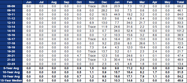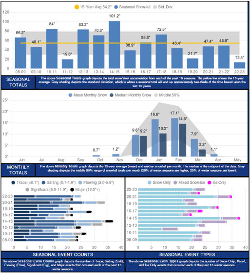 A snowfall climatology is the statistical values and metrics associated with snowfall (or ice) at a specific region or location over a specific period of time -- at least the most current 5 seasons but you may look for up to 30 or more seasons. At a minimum, the metrics should include annual snowfall, average snowfall, number of events and incremental event breakdown.
