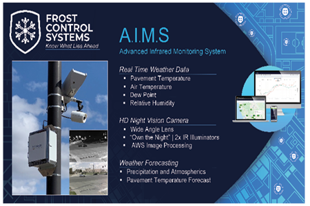 The Advanced Infrared Monitoring System (A.I.M.S) is a fully integrated, wireless, weather platform that empowers operators with the situational awareness needed to make real-time operational decisions. AIMS provides operators with high-definition imagery, accurate weather atmospherics, forecasting, and pavement temperature. A.I.M.S is accessible from anywhere via mobile web or desktop applications.