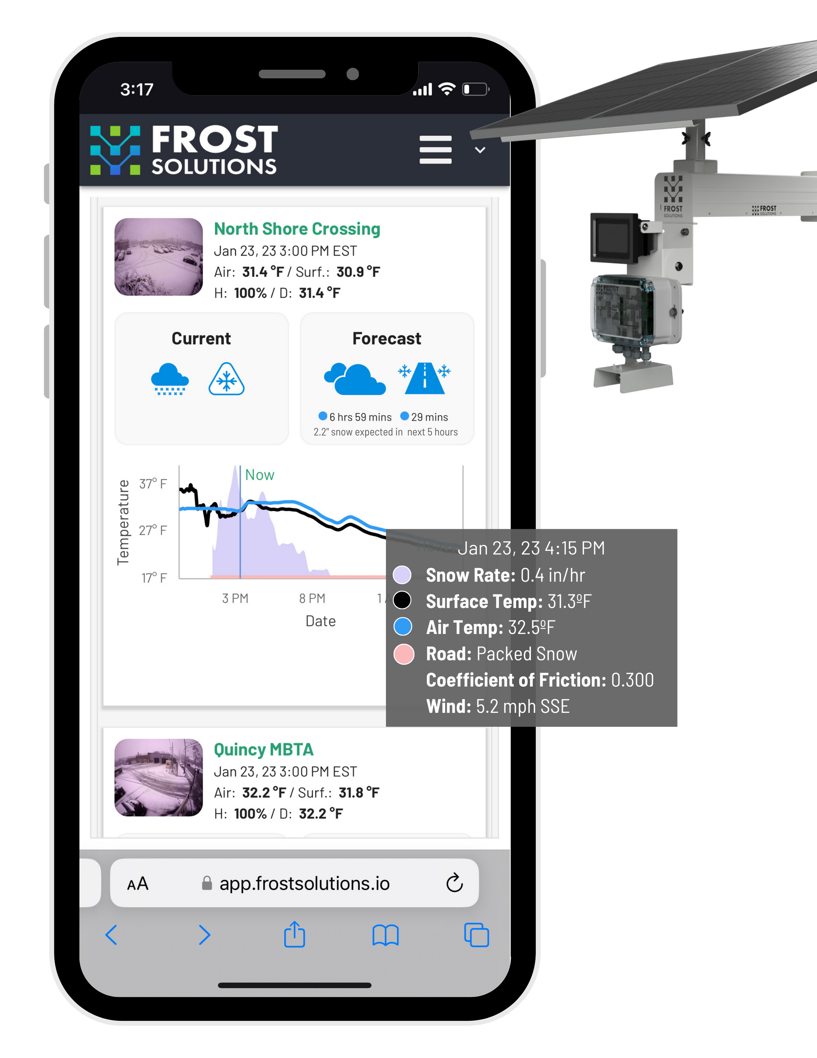 The Frost Mini-Weather Station delivers hyper-local forecasts using minute-by-minute data and AI-powered image analysis. With a wide-angle camera, 72-hour outlook, customizable alerts, and smart pavement learning, it keeps you informed of changing weather, road, and surface conditions—day or night.