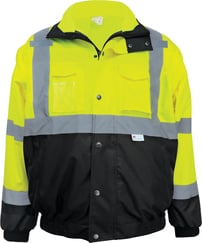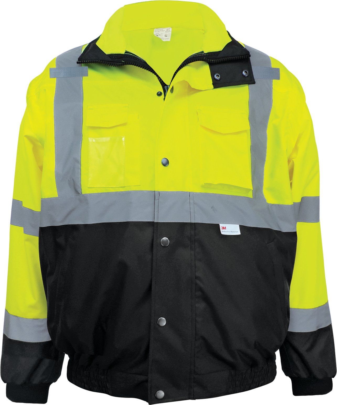 Stay safe with Lawson Products' ANSI (American National Standards Institute) Class 3 High Visibility 8-in-1 Bomber Jacket has a Detachable Hood, Removable Inner Fleece Jacket and Six Pockets (Four Outside, One Inside w/Hidden Zippered Pocket). The Outer Jacket and Sleeves Unzip. Material is PU Coated 300 Denier Oxford.