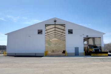 Legacy offers high-quality fabric buildings for salt/sand storage. A durable rigid frame – instead of hollow-tube, web truss framing – provides several engineering advantages, including customization to exact width, length and height. Straight sidewalls maximize useable square footage. I-beams can be epoxy-coated for maximum corrosion protection. Translucent PVC cladding allows natural daylighting.