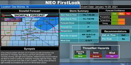 The NEO First Look is a winter-event specific forecast that is delivered 48 hours or more before a storm. This provides detailed information on what to expect with start/stop times, snow amounts, impacts & hazards and confidence. This product is used to create an operations plan around the weather event.