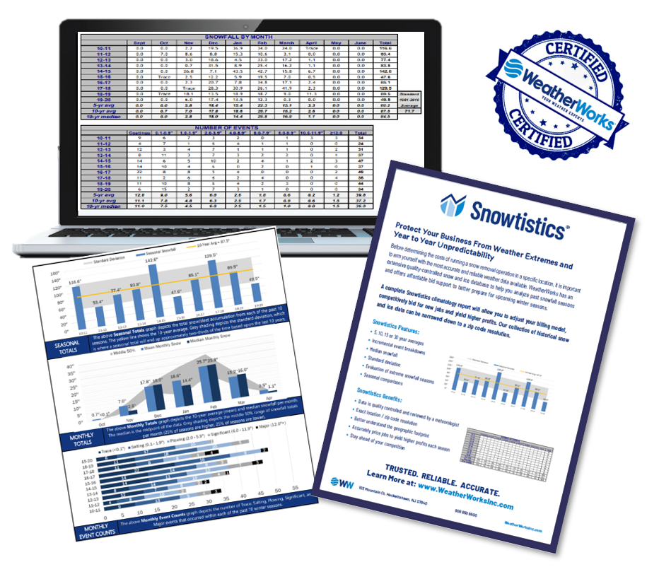 Don't leave your snow removal contracts to chance. Partner with WeatherWorks and harness the power of Snowtistics® to revolutionize your approach to bidding and contract preparation. Visit us online at www.weatherworksinc.com or call (908) 850-8600 to learn more.