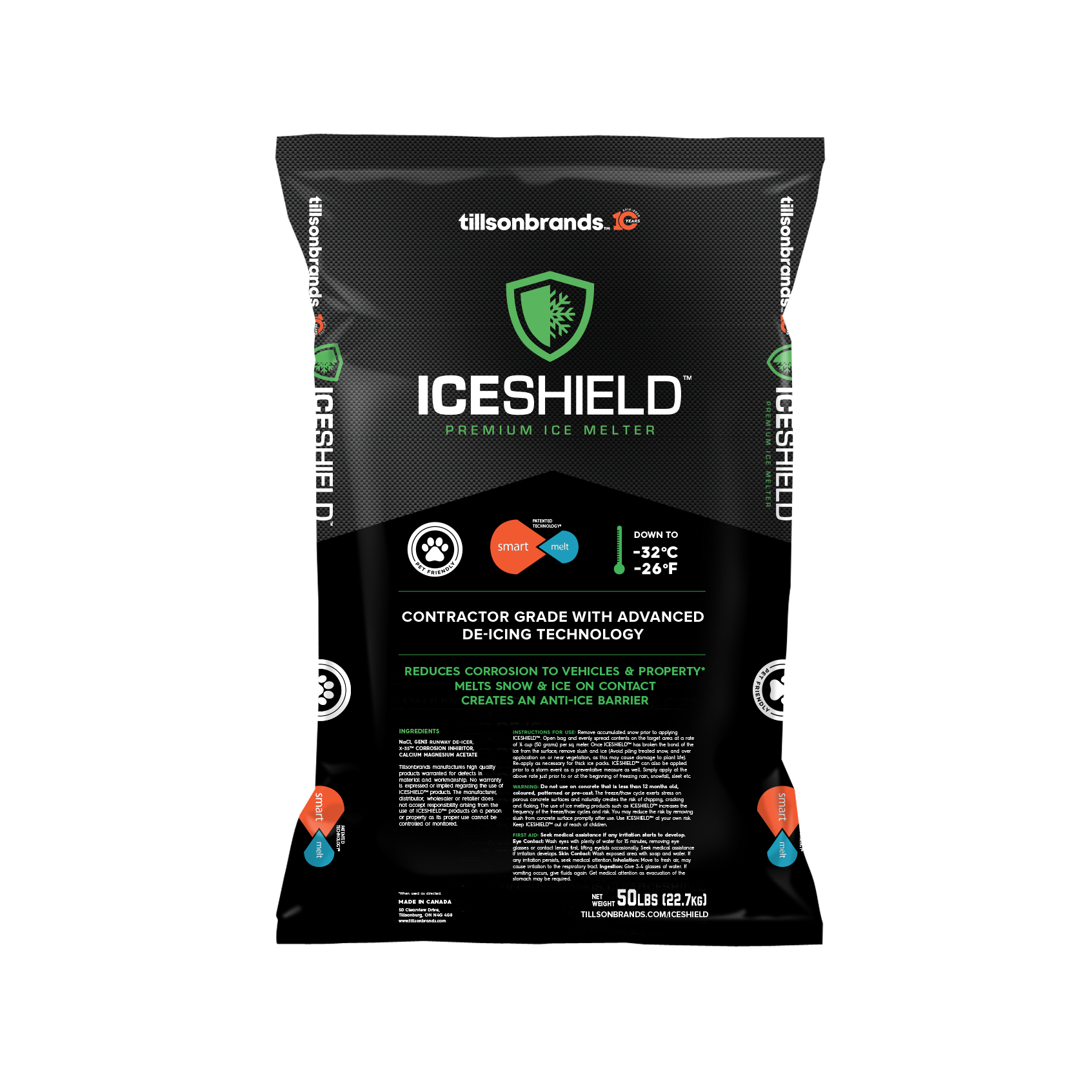 Combining state-of-the-art ice-melting technology from the aviation industry and the superior anti-corrosive and residual effect properties of Calcium Magnesium Acetate (CMA), ICESHIELD™ Premium Ice Melter becomes the most advanced commercial ice melter on the market today. Many products claim to be low corrosive or great ice melters, but ICESHIELD™ is the first product that can genuinely deliver both while providing great before-the-storm anti-icing benefits.