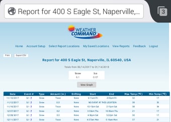 Certified Site-Specific Snowfall (CSSS)(TM) Reports provide fast, accurate address specific snow & ice totals for snow removal contractors, property managers and municipalities with an independent, third-party post-storm analysis and report. Certified Consulting Meteorologist oversees all data incorporated into the reports and certifies the accuracy down to 1/10th of an inch for snow and 1/100th of an inch for ice. Reports are customizable to view by event, date range, month or season.