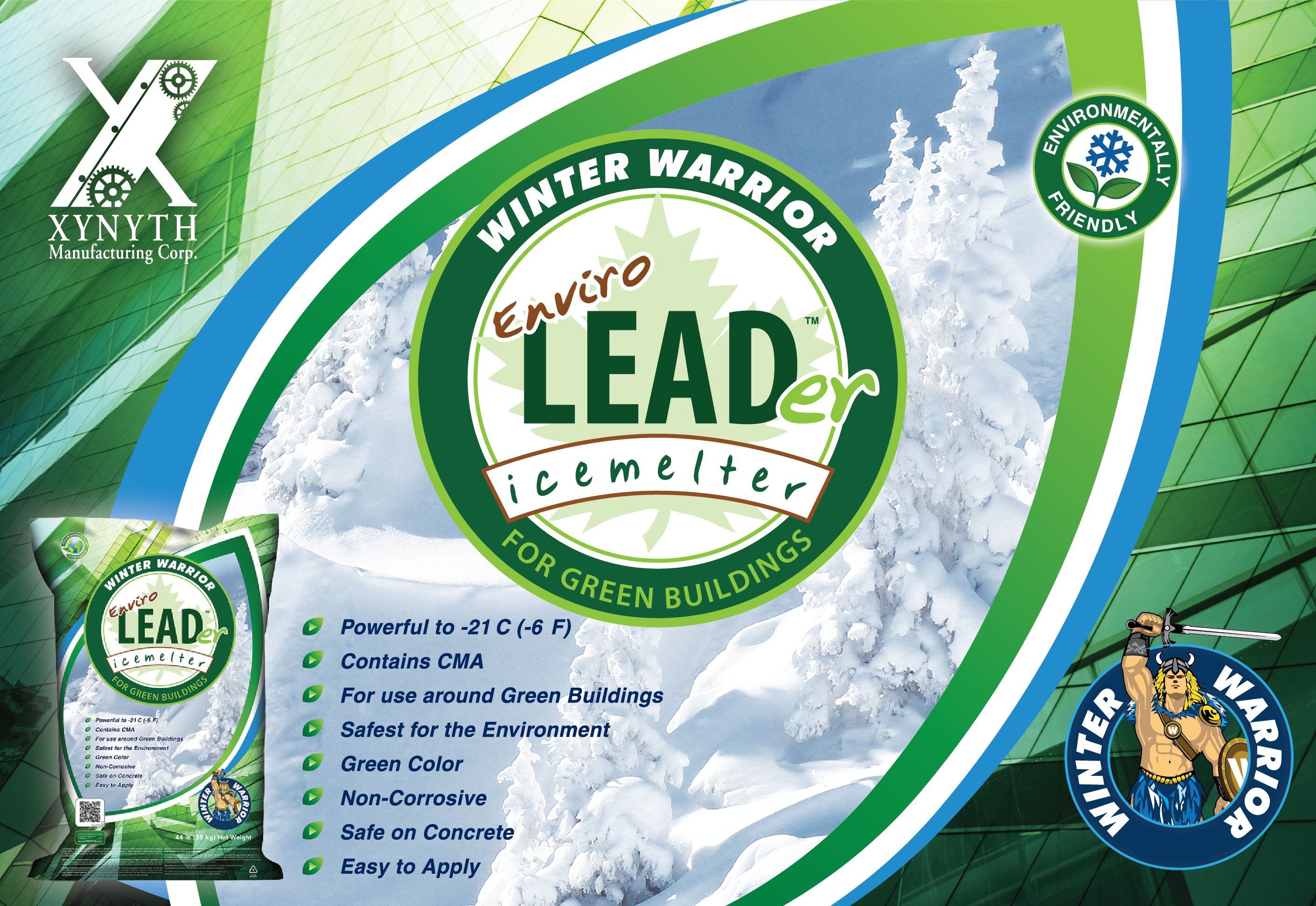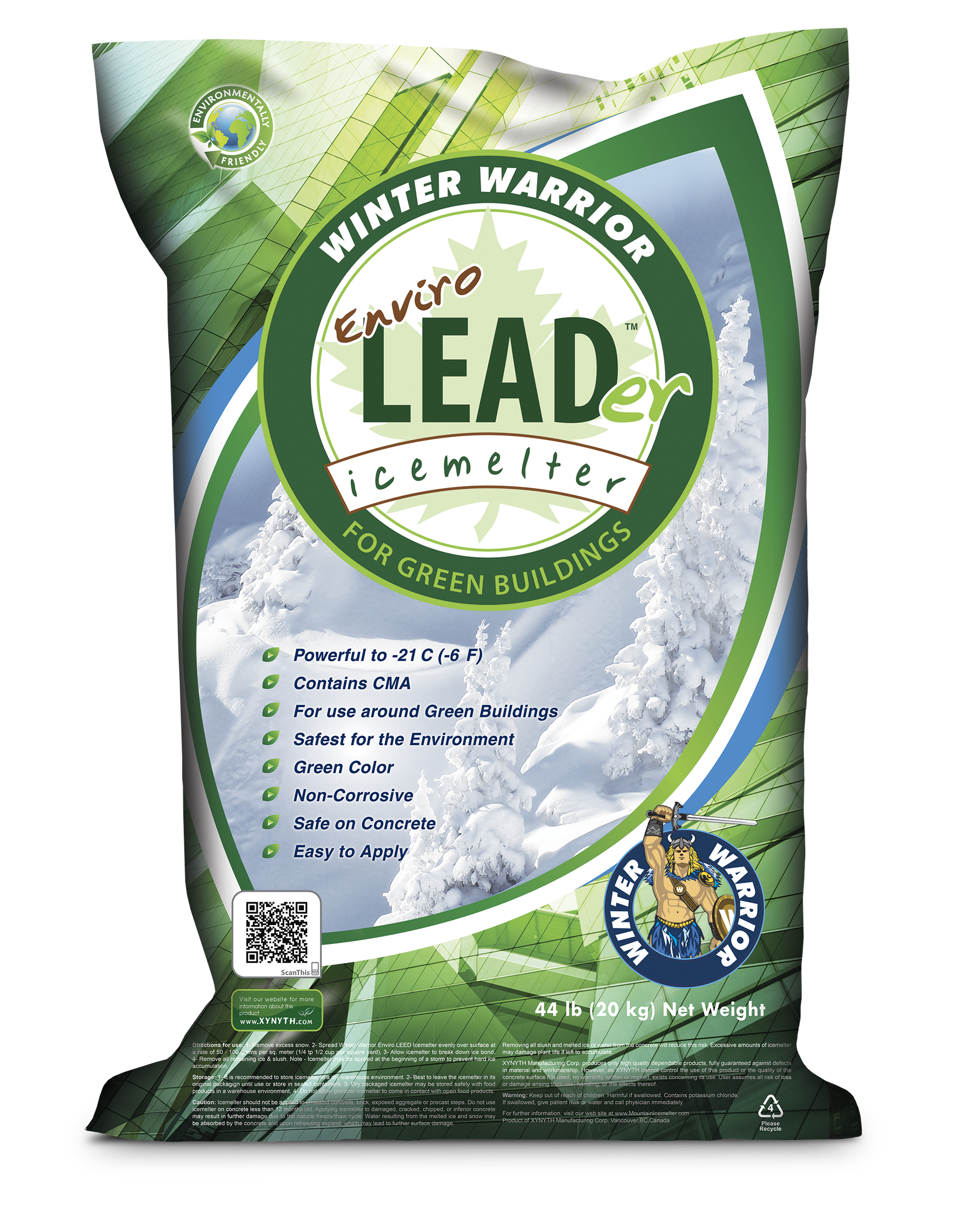 Introducing Winter Warrior Enviro LEADer by XYNYTH, the ultimate eco-friendly ice melt solution. Engineered for performance, it tackles ice in temperatures as low as -21°C (-6°F) with its powerful formula containing CMA. Designed for use around LEED (green) buildings, it's the safest choice for the environment, non-corrosive, and concrete-safe application.